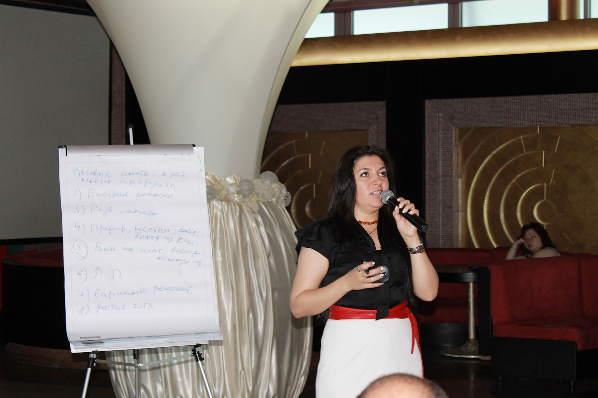 Яна Агоева, директор компании «Direct»: ТОП-рекрутинг и организация event-мероприятий; эксперт по системному росту и мотивации личности;бизнес-тренер по управлению персоналом, снователь и президент HR-club Odessa, автор и ведущая проекта «HR-встречи с Агоевой Яной», акцентировала внимание на постоянно меняющихся условиях работы, которые требуют новых методик и способов ведения бизнеса и делового общения, если риелтор хочет добиться успеха в непростое время. Что необходимо специалисту для его дальнейшего роста и саморазвития, как начать управлять собственной жизнью и деловыми успехами - спикер раскрывала секреты психологического подхода.