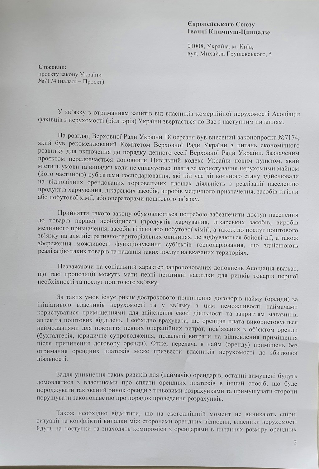 Асоціація вважає, що цей закон не тільки порушує права та інтереси власників-орендодавців комерційної, але й містить в собі негативні наслідки для ринків товарів першої необхідності та послуг поштового зв’язку.