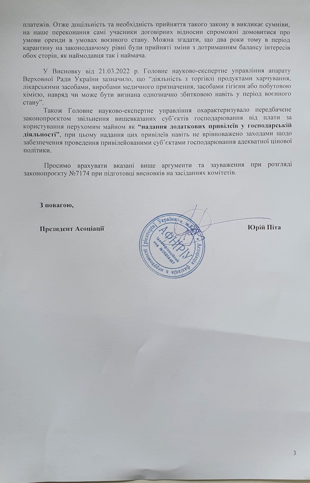 Асоціація вважає, що прийняті зміни не забезпечують дотримання балансу інтересів обох сторін, як наймодавця так і наймача, а також безпідставно надають додаткові привілеї у господарській діяльності певним суб’єктам господарювання.