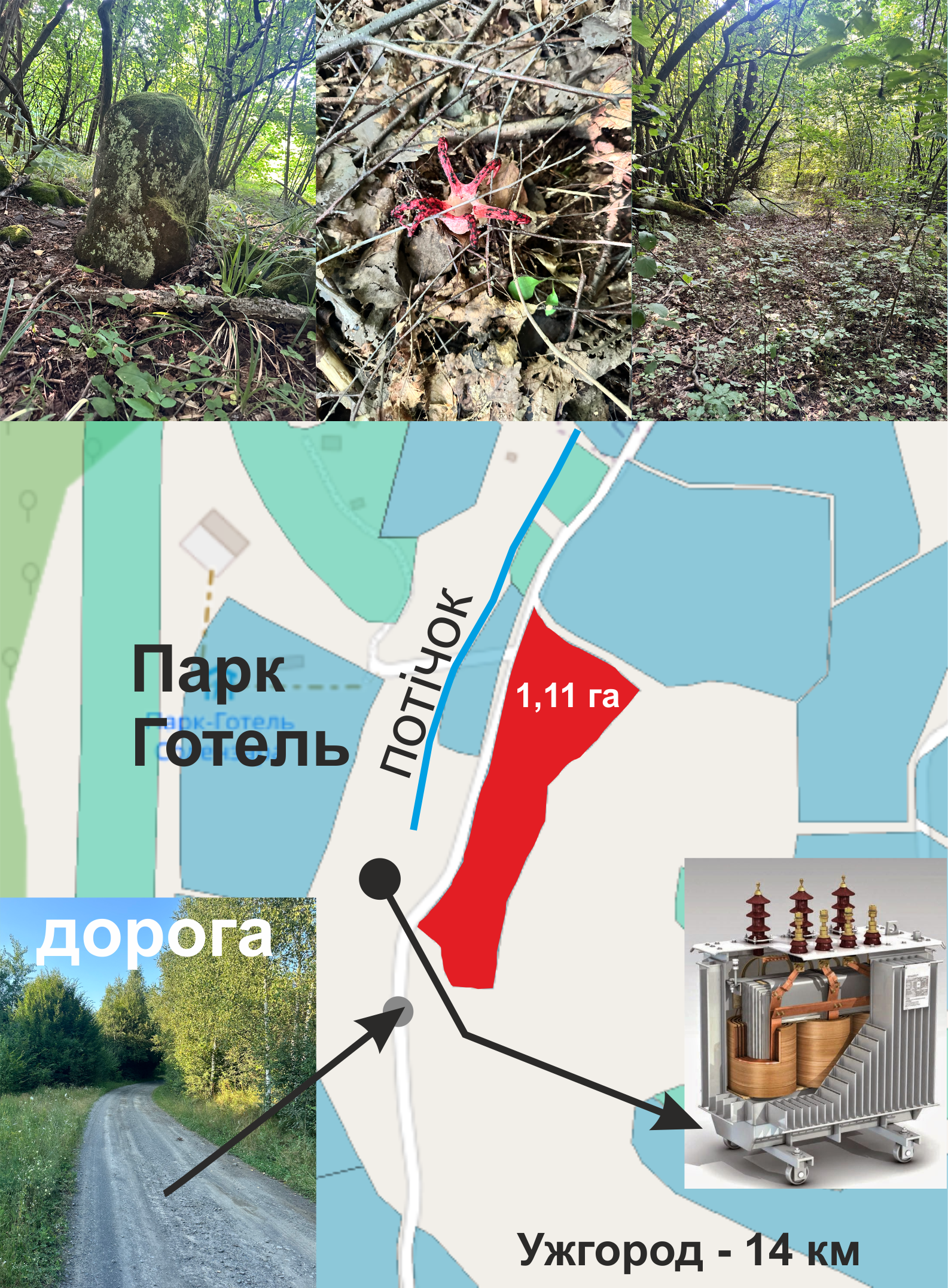 Поряд трансформатор, потічок, ліс.