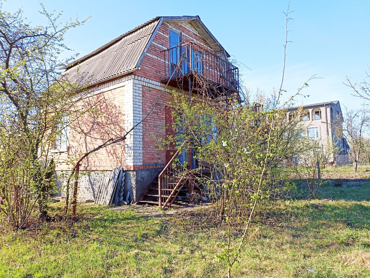 Цегляний будинок з добротним фундаментом, перекриття між поверхами плити. Дві кімнати – спальні (на першому і другому поверхах), кухня та коридор. На весь будинок є підвал, вхід з вулиці. На другий поверх сходи на вулиці. Комунікації – світло в будинку (лічильник), вода – криниця на вулиці, газ – проходить по вулиці. На ділянці невеликий фруктовий сад.