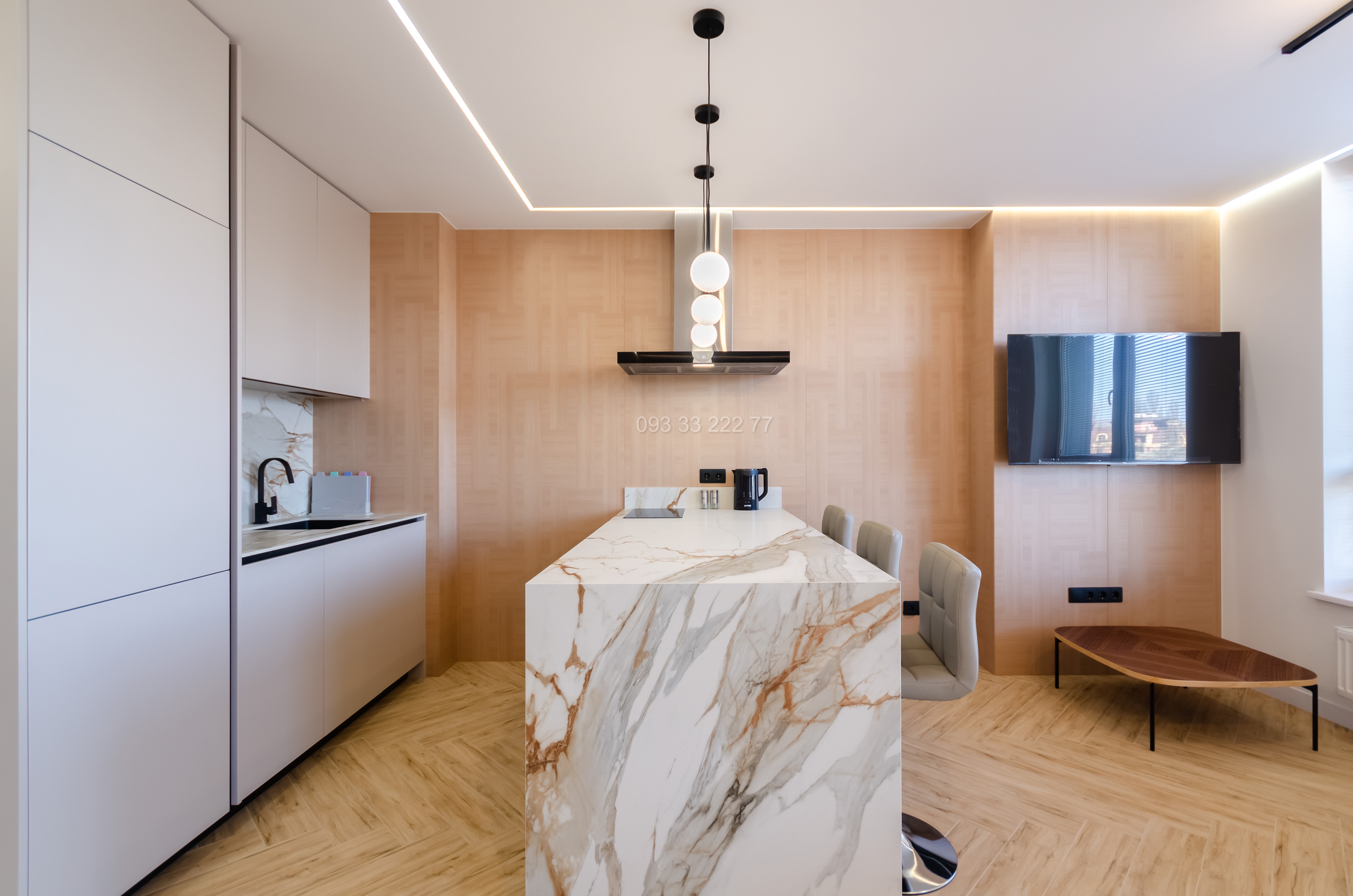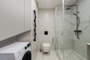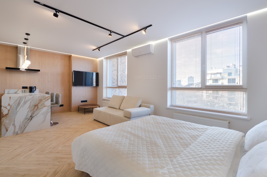 Обладнана необхідними якісними меблями та технікою для комфортного проживання: двоспальне ліжко з ортопедичним матрацом, зручний диван, столешня на кухні з натурального каменю, варильна поверхня, духова шафа, мікрохвильова піч, витяжка, вбудований холодильник, посудомийна машина 45 см, плазмовий телевізор з діагоналлю 55 дюймів, інверторний кондиціонер, душова кабіна, пральна машина автомат, бойлер на 50 літрів, пилосмок, праска. Тепла підлога у санвузлі.