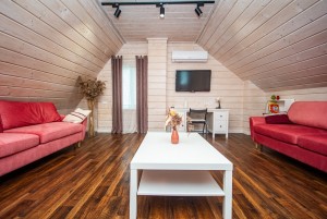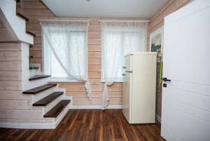 На першому поверсі розташована кухня-вітальня з каміном 18 кв. м., коридор та сумісний санвузол із душовою кабіною. Тепла інфрачервона підлога. Тераса