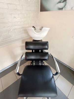 Здається з обладнанням. Три перукарських крісла, крісло для миття…