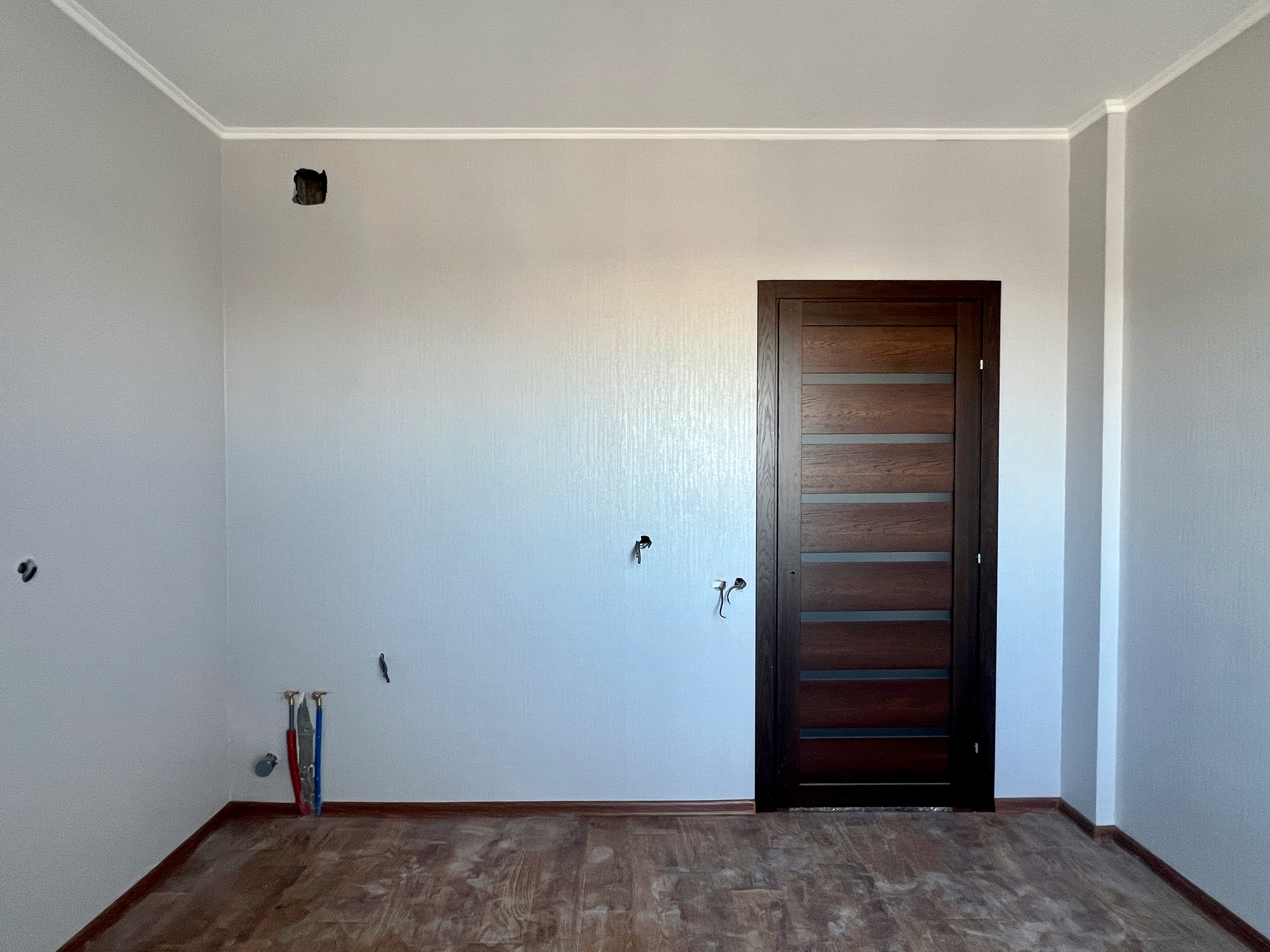 Будівельне оздоблення: - Двокамерні металопластикові вікна REHAU - Міжкімнатні двері з фурнітурою - Лінолеум, шпалери, плінтуси - Радіатори опалення з регуляторами - Повний комплект сантехніки у санвузлі - Централізоване гаряче водопостачання - Лічильники води, електроенергії та тепла - Металеві вхідні двері