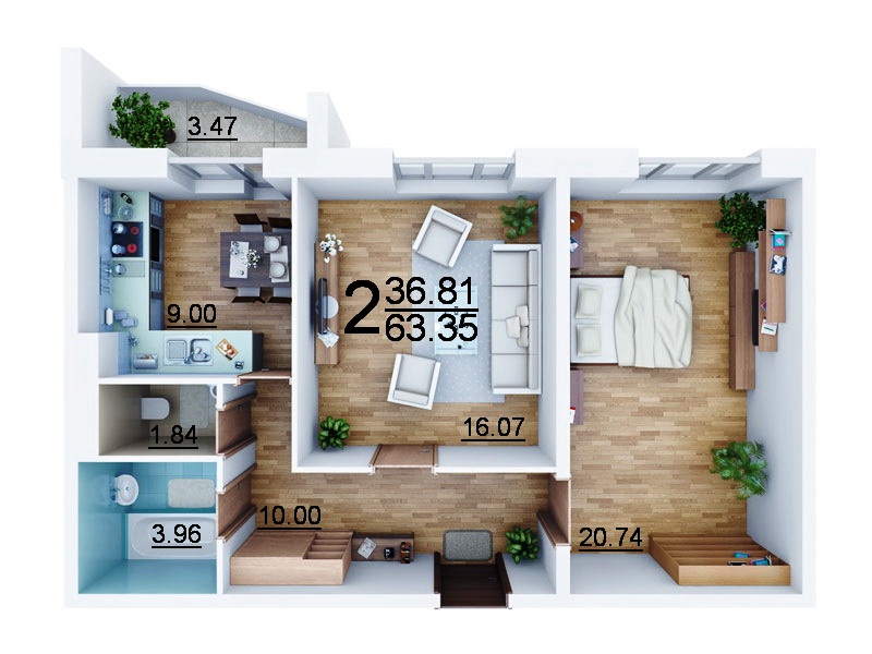 Общая площадь — 63,35м,
