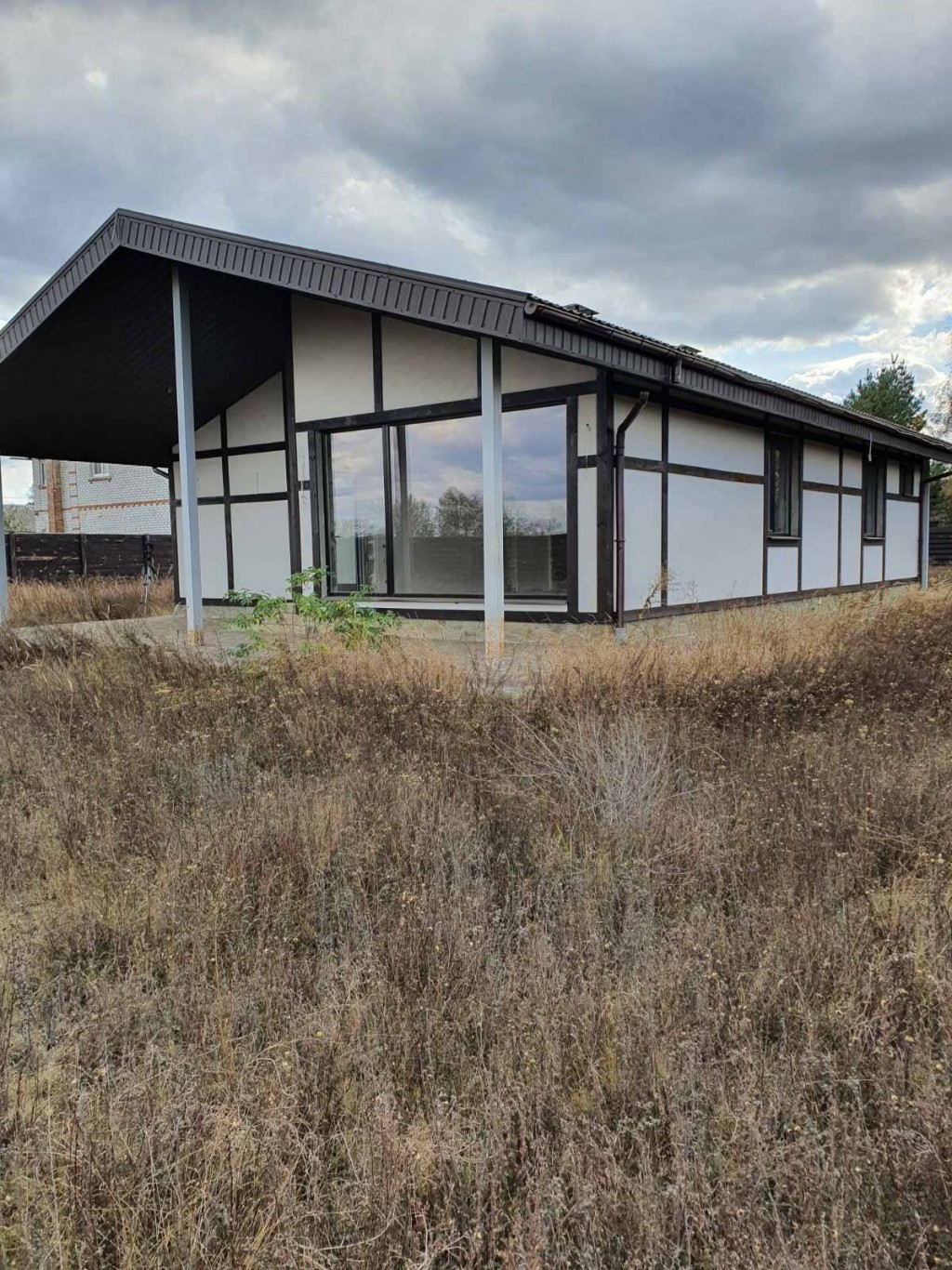 - гостиная с панорамным окном выходом на большую веранду с навесом