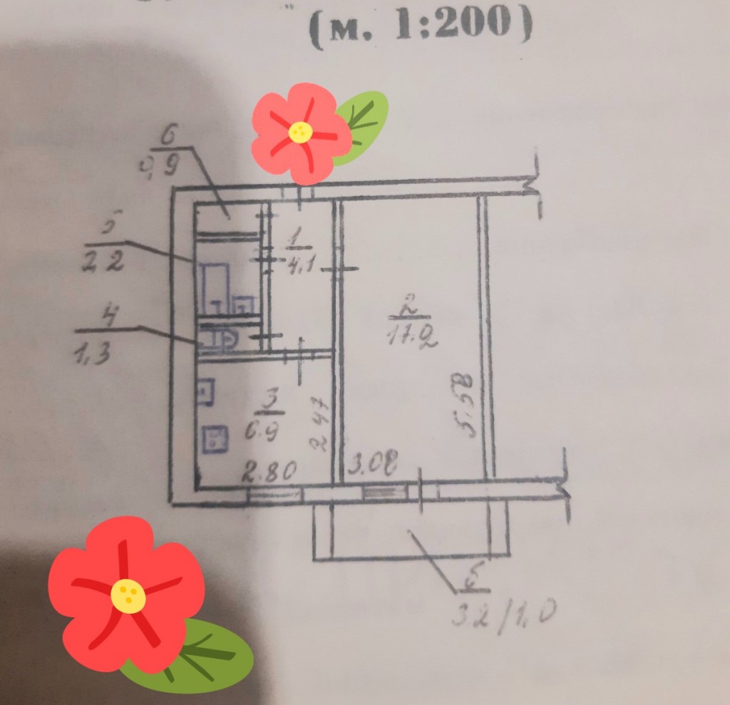 - общая квадратура - 33.6 кв. м, жилая - 17.2 кв. м, кухня - 7 кв. м