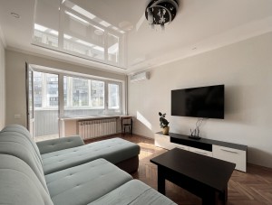 Обставлена итальянской мебелью. В каждой комнате LED телевизоры SAMSUNG 55" и 43", кондиционеры, посудомоечная машина, бойлер 100л, система тройной очистки воды. По всей квартире светодиодное освещение. Скоростной интернет и кабельное ТВ.