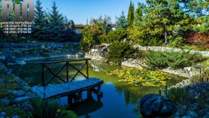 Територія вся огороджена цегляним парканом, ландшафтний дизайн подвір'я, плодовий сад з фруктовими деревами та кущами, хороший виноградник на перголі, зариблений ставок , бруківка.