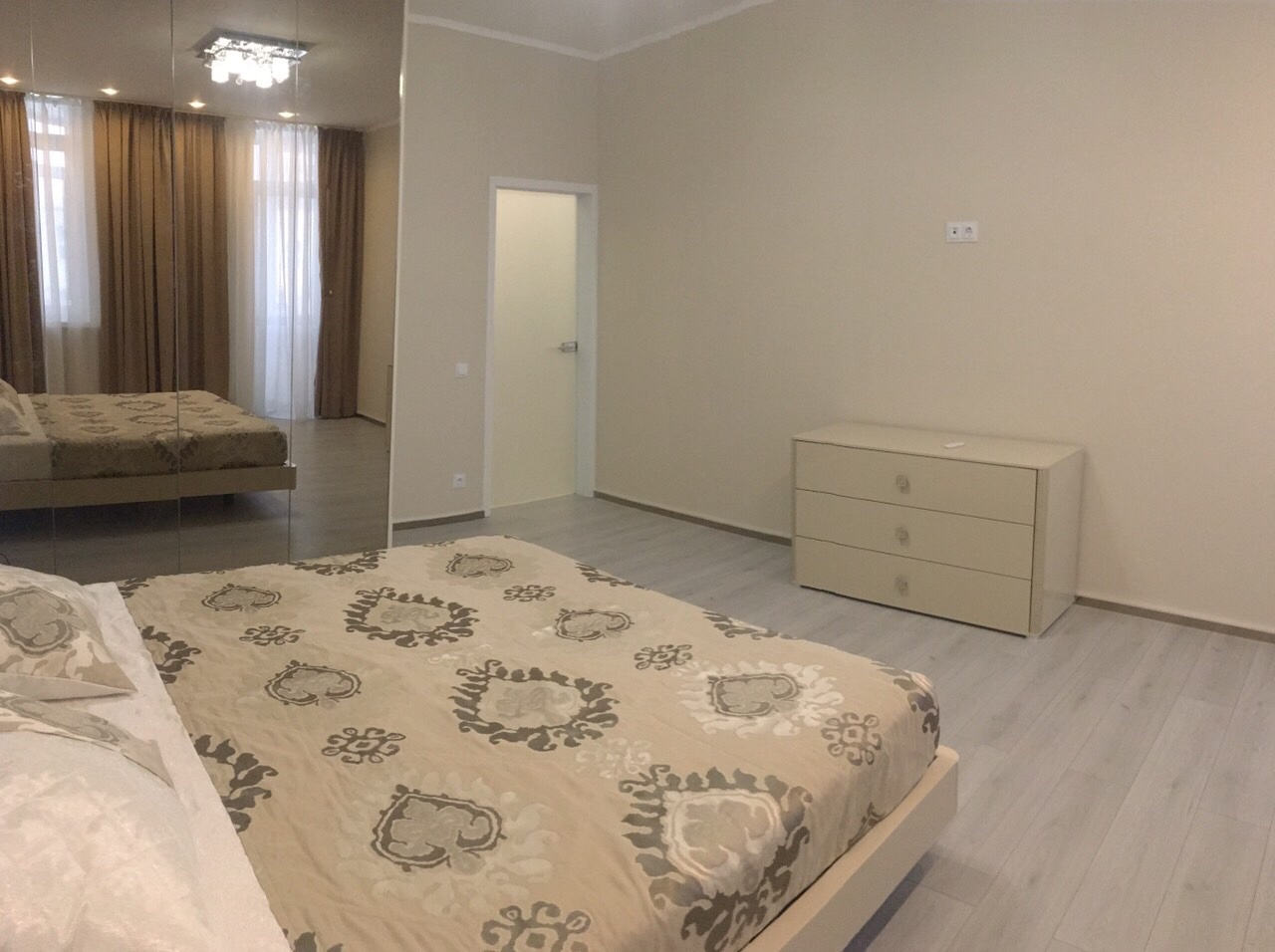 Загальна площа - 110 кв.м: кухня-вітальня, три спальні, два санвузли, вбиральня, балкон.