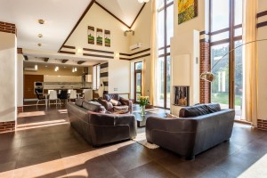 - простору вітальню 100м2 з вітражними вікнами та каміном