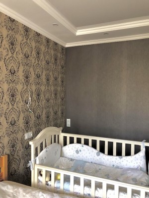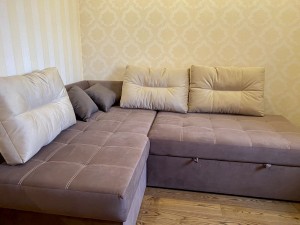Дубовый стол, огромный шкаф-купе. Спальня 1 (она же детская) огромный раскладной диван с системой хранения вещей, стенка со шкафами, письменный стол. Спальня 2 - 2спальная кровать, детская кроватка, выход на балкон, оснащённый доской Евминова, турником-брусьями, тренажером для пресса.