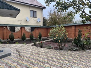 На участке оборудована зона отдыха с барбекю и капитальная крытая беседка из красного кирпича, двор выложен тротуарной плиткой, высажены деревья хвойных пород, инжир, цветочные клумбы и зеленые газоны. Есть вольер для собак.