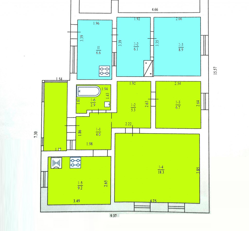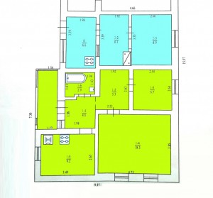 1) перша частина будинку загальною площею 46, 4м2 та складається: