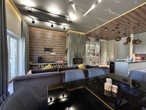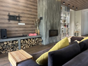 – вбудована кухня з фурнітурою Blum та камяною столешнею, меблі на замовлення, камін, техніка високого класу