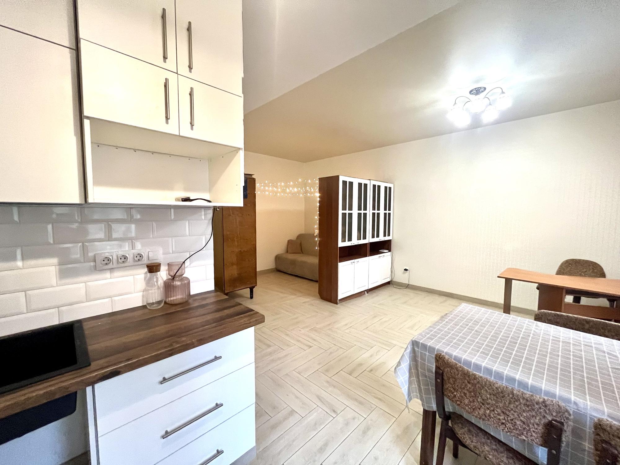 Загальна площа - 31,3 кв.м. Квартира студійного типу, відкритий простір, утеплений балкон, санвузол з душкабіною.